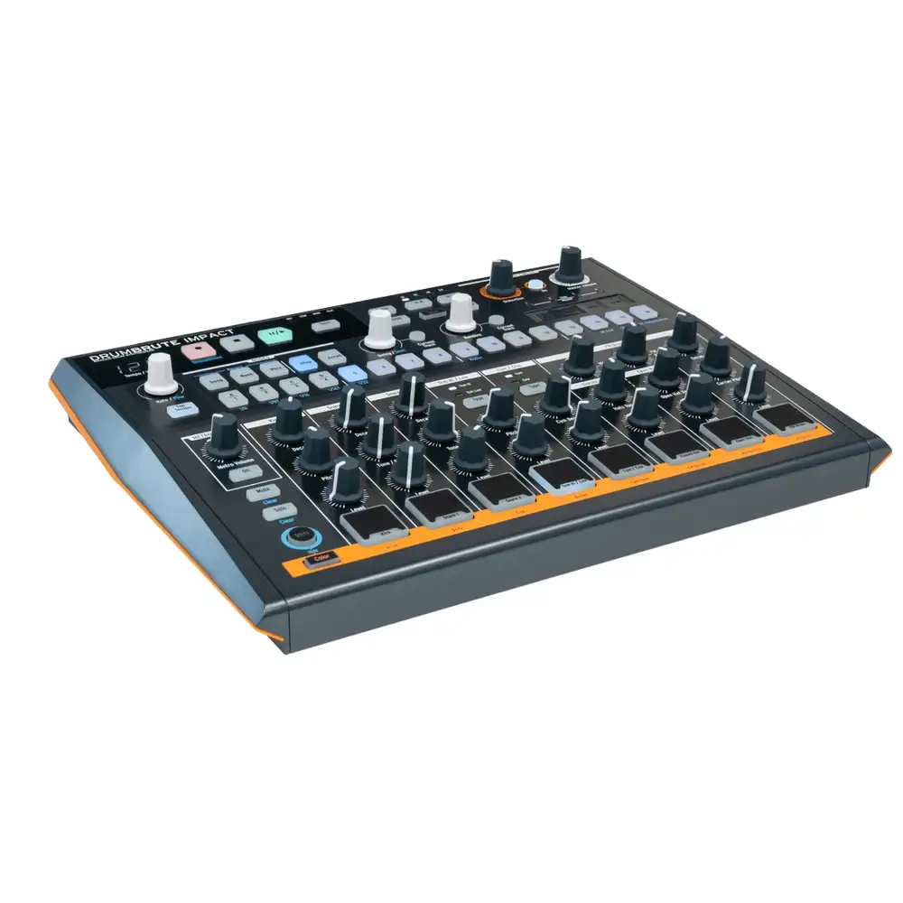 IMPACT è nato sulla base del grande successo di DRUMBRUTE, ma in questo caso gli ingegneri di ARTURIA hanno progettato uno strumento molto differente rispetto al suo predecessore, infatti questo prodotto mette a disposizione dei fruitori un vero e proprio nuovo sound-set, sempre con sonorità interamente analogiche complete di parametri regolabili di delay, pitch e snap. il pannello è concepito per essere intuitivo e utilizzabile alla perfezione sia in studio sia nelle performance live, con rotativi di ottima fattura che garantiscono affidabilità e massimo controllo. per aumentare il contenuto armonico e conferire maggiore carattere al suono è stata aggiunta "color", una funzione esclusiva che può essere attivata per ogni singolo strumento, o per step, fornendo un nuovo livello di controllo tonale. è possibile utilizzare la touch strip per creare in tempo reale glitch e step repeat, animare un singolo strumento o l'intero pattern con il potenziometro "random" dedicato e aggiungere variazioni al groove con la funzione "swing". sia che si desideri creare complessi poliritmi in sequenza, ritmi diretti e martellanti o registrare una performance di finger-drumming, la drumbrute impact renderà quest'esperienza unica e divertente. grazie ad una vasta gamma di opzioni di sincronizzazione e connettività è possibile collegarsi e suonare praticamente con qualsiasi altro strumento. drumbrute impact è una drum machine per musicisti e produttori che ricercano potenza, controllo, connettività e affidabilità senza compromessi. a seguire ne elenchiamo le principali caratteristiche: